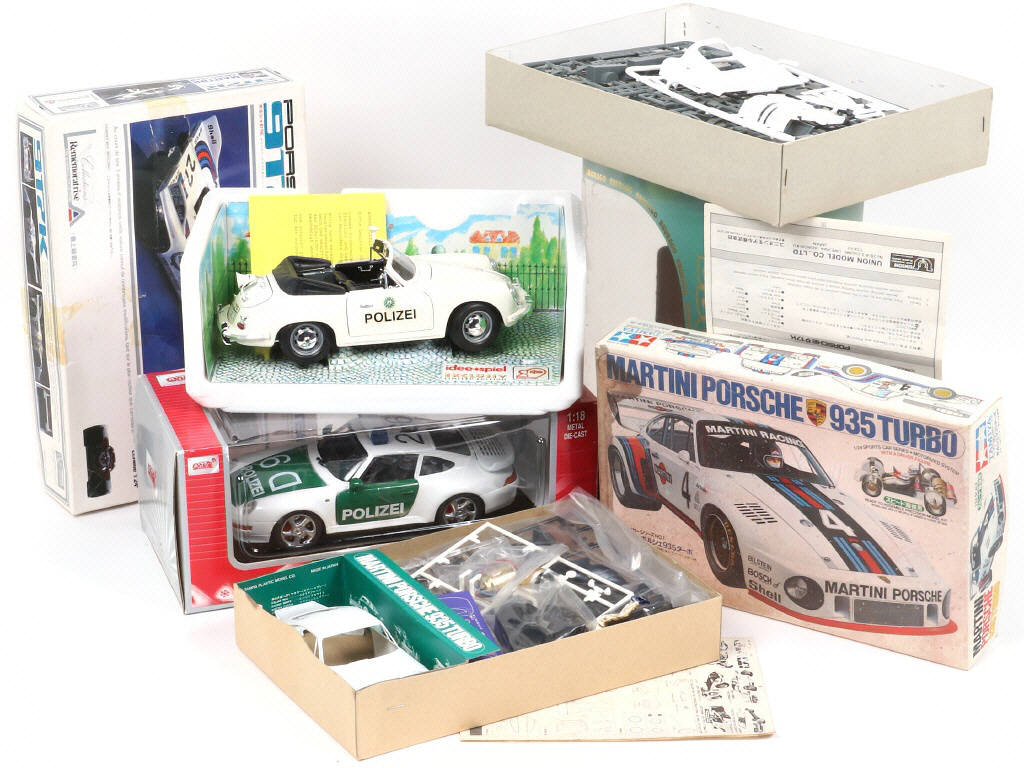 échelle 1/18ème - manque un gyrophare - les boîtes sont en état 'b' & 'c' - on y retrouve les marques : ANSON & BBURAGO - on y joint 2 maquettes de PORSCHE de course à monter en état 'A'.'b' (manque vraisemblablement quelques accessoires, une boîte tâchée)