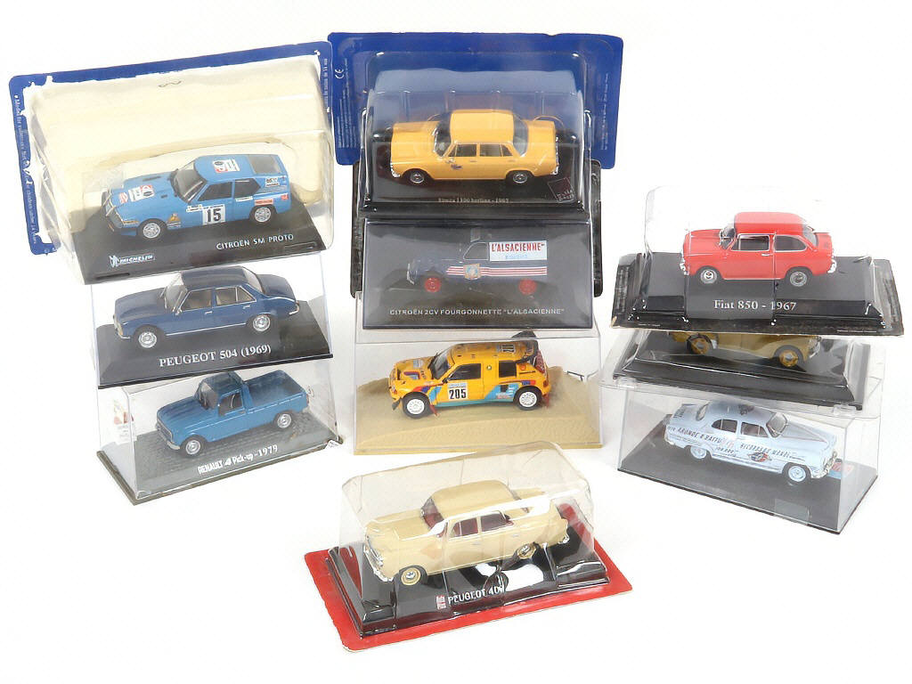 miniatures reproduisant notamment les modèles : RENAULT, PEUGEOT & CITROËN - on y retrouve notamment la marque EDITIONS ATLAS - un pare-bluffle cassé (état 'A') - une boîte en état 'c'