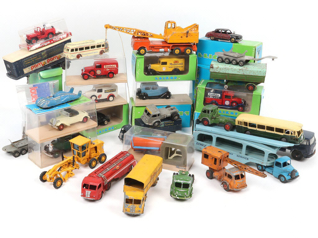 on y retrouve notamment les marques : ELIGOR, C.I.J & DINKY TOYS - avec manques & parties cassées sur certains exemplaires - les boîtes présentées sont en état 'a' à 'e'