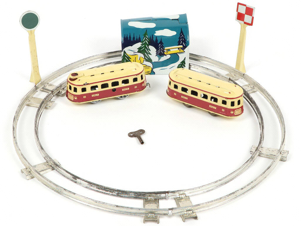 contient : un monorail à 2 éléments (moteur à clef fonctionne) - contient : un tunnel, rails, clef (non d'origine) & cale de boîte - rails ternies