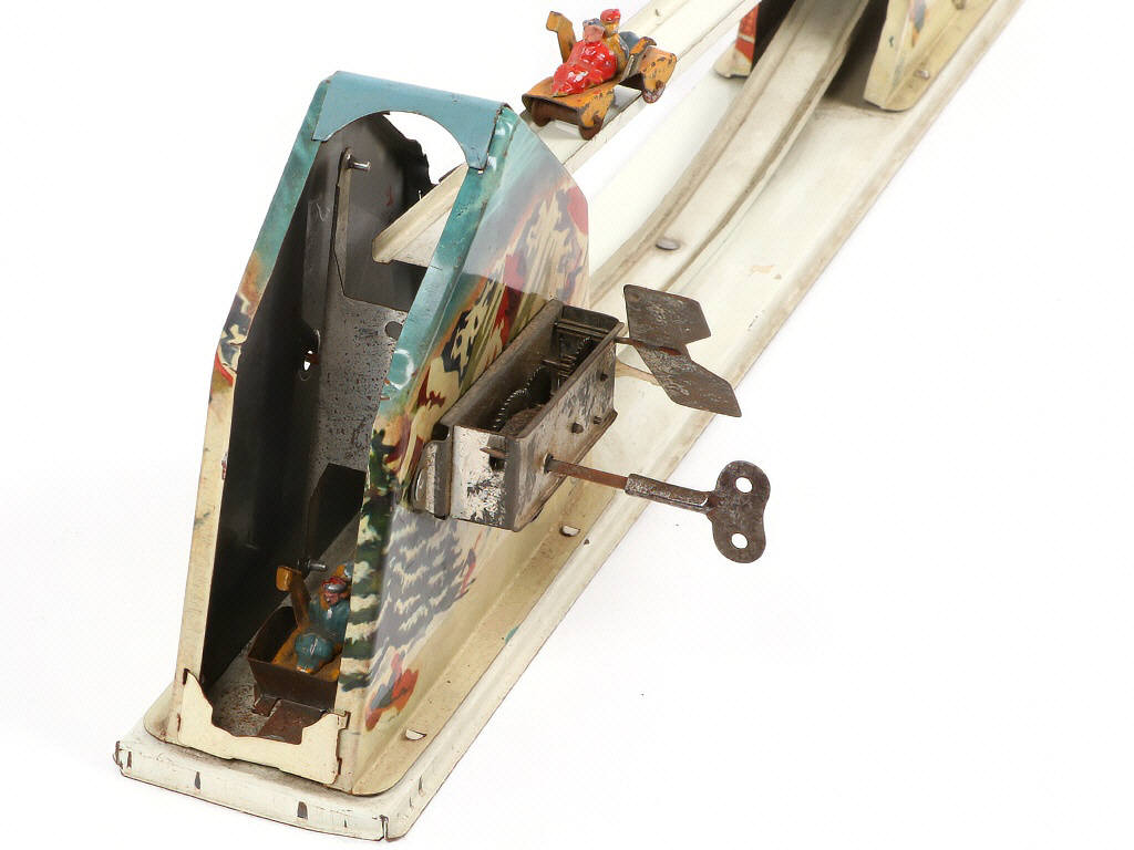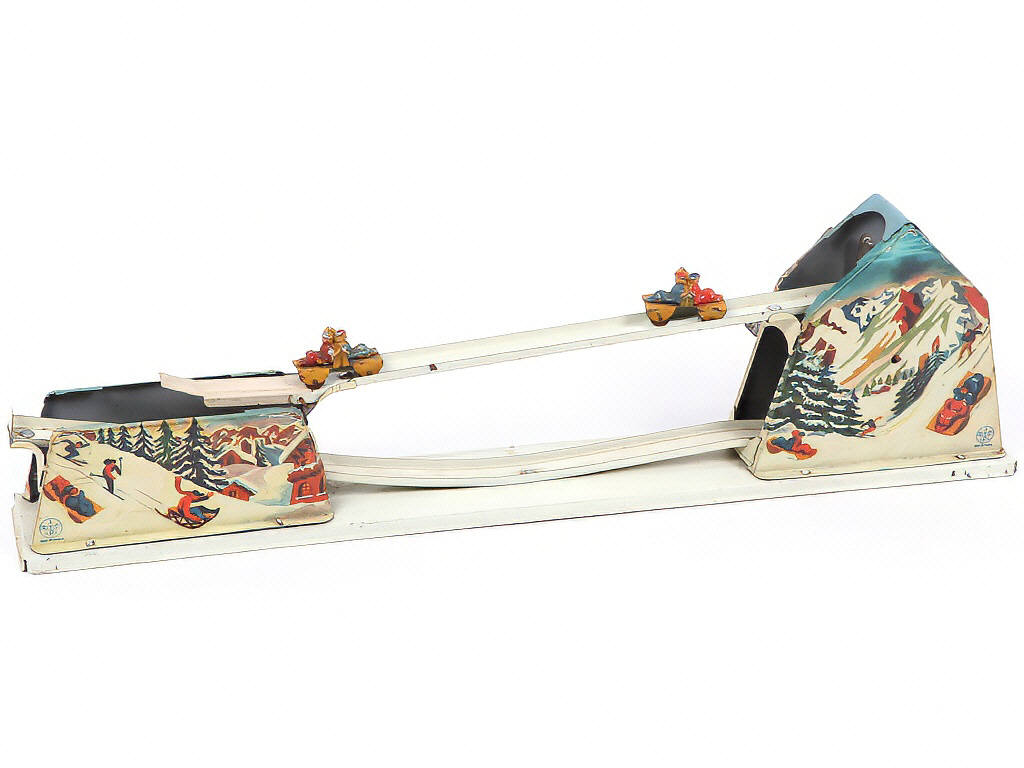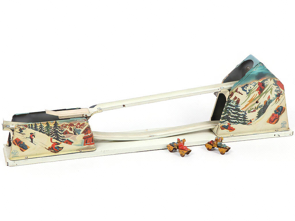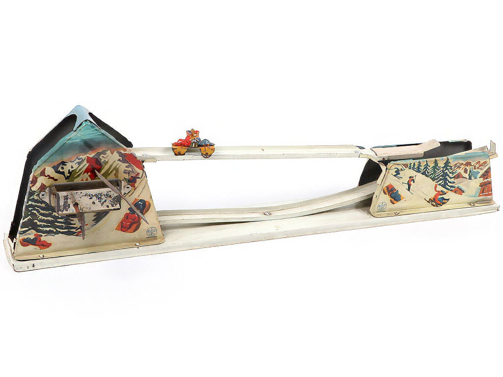 longueur 50 cm - moteur à clef (fonctionne) - avec clef non d'origine - en action, les 2 luges avec les personnages descendent une des pentes, puis sont soulevées une à une pour dévaler la piste supérieure - petites traces d'oxydation par endroits - ensemble encrassé