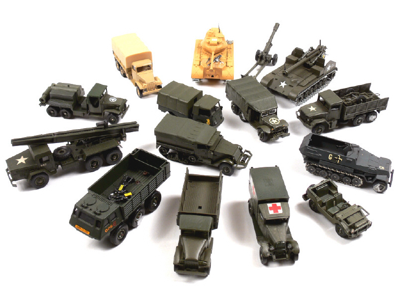 comprend : un GENERAL PATTON M47, un canon automoteur de 155 mm, GMC bâché, KAISER JEEP 6x6, DODGE 6x6, GMC plateau à ridelles, BERLIET ALVIS 6x6, GMC auto-pompe, CITROËN C4F ambulance, UNIC lance-missile, HALF TRACK M3, RENAULT 4x4, SDKFZ 251 & MERCEDES - petits manques - 5 modèles avec jantes fondues