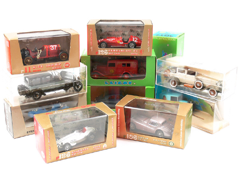 miniatures reproduisant les modèles : CITROËN, FERRARI, DARMONT, FIAT, FORD, JAGUAR, ISOTTA FRACHINI & MASERATI - on y retrouve les marques : BRUMM, ELIGOR & RIO - 4 boîtes en état 'c'