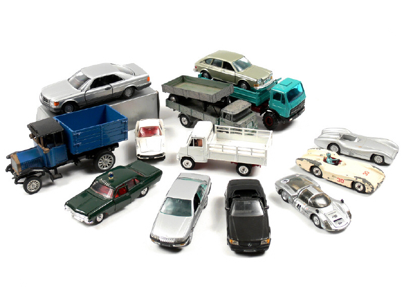 états de 'B' à 'R' - miniatures reproduisant les modèles : BMW, MERCEDES (un modèle en boîte en état 'd'), MAN (plateau dériveté), HANOMAG, PORSCHE, OPEL, KRUPP & VOLKSWAGEN - on y retrouve les marques : DINKY TOYS GB & FRANCE, GAMA, ZISS MODELL, CONRAD, NZG, MÄRKLIN & RW MODELL - petits manques