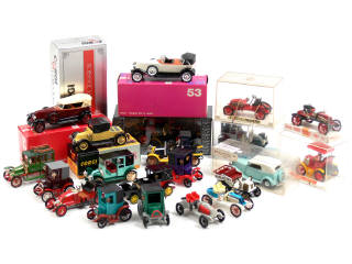 on y retrouve les marques : DEL, RIO, BRUMM, MINIALUXE, J.M.K., SAFIR, CLE, DUBRAY & CORGI TOYS - 10 véhicules en boîte (états de 'b' à 'c') - quelques petits manques