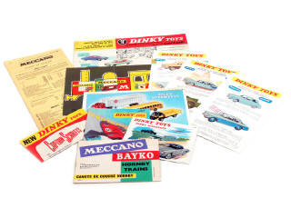 on y retrouve les marques : DINKY TOYS GB (1964), DINKY TOYS FRANCE (1958 &1970-71) & MECCANO (1963 & 1964) - on y joint 4 listes de tarifs - 5 affichettes en état 'c' & une avec annotations