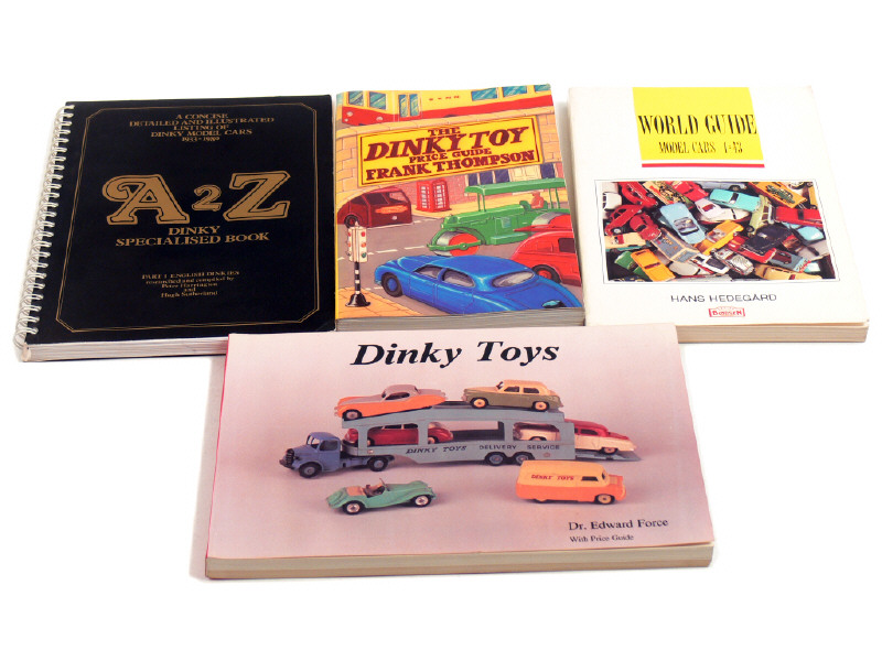 comprend : 'A2Z DINKY SPECIALIZED BOOK' de Peter HARRINGTON & Hugh SUTHERLAND, 'WORLD GUIDE MODEL CARS 1:43' de Hans HEDEGARD, 'THE DINKY TOY PRICE GUIDE' de Frank THOMPSON & 'DINKY TOYS' de Edward FORCE - ouvrages en langue anglaise