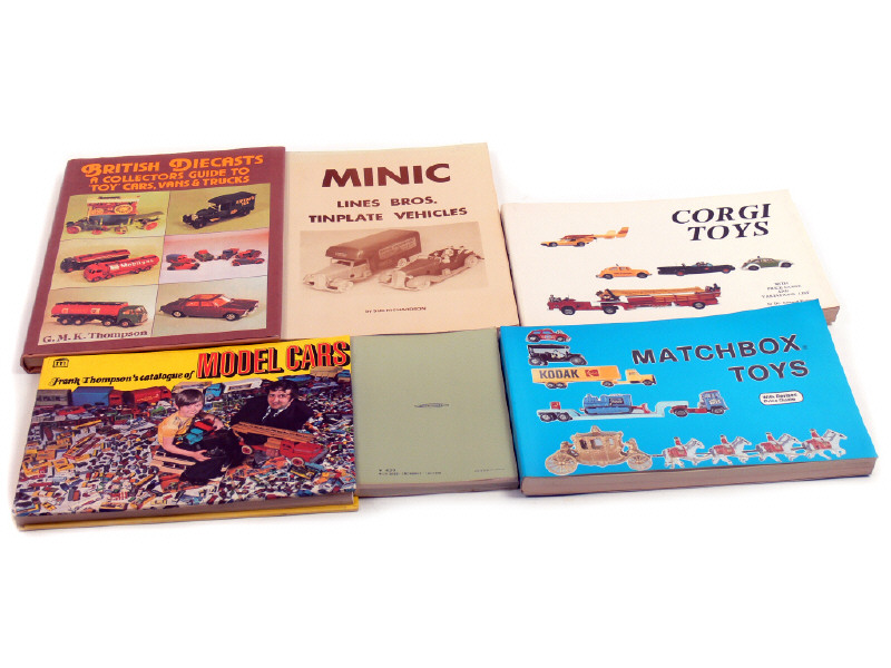 comprend : 'BRITISH DIE CAST' de G.M.K. THOMPSON, 'MINIC LINES BROS. TINPLATE VEHICLES' de Sue RICHARDSON, 'CORGI TOYS' de Edward FORCE, 'MATCHBOX TOYS' de Nancy SCHIFFER, 'MODEL CARS' de Frank THOMPSON & un livre sur une collection japonaise - ouvrages en langue anglaise