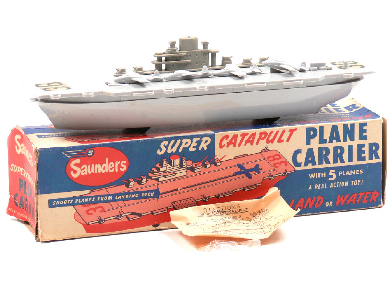 longueur 31 cm - réalisation en plastique des années 60 - avec système de catapulte (non testé), 4 avions dans leur sachet d'origine & notice - manque un avion & un autocollant de superstructure