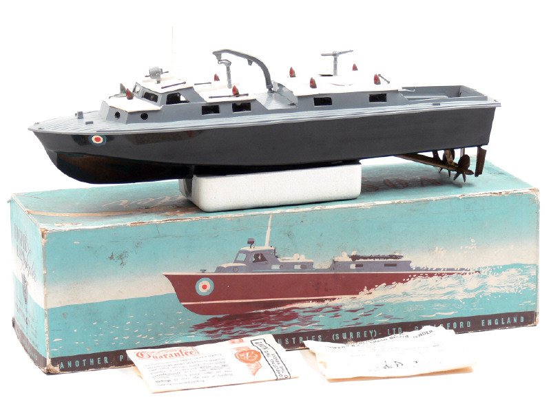 longueur 42 cm - moteur à piles (fonctionne) - avec notice, bon de garantie & cale de boîte - manque courroie d'entraînement du moteur aux hélices & antenne radio - quelques fêlures à l'arrière de la coque - petites traces d'oxydation sur les parties métalliques