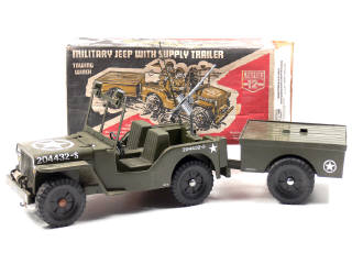 longueur de l'ensemble 77,5 cm - modèle réalisé en plastique & destiné à accompagner les figurines du style GI JOE ou ACTION MAN - avec antenne, treuil & mitrailleuse - manque quelques petits accessoires - embouts d'axes de roues avant légèrement oxydés