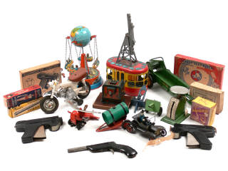 états de 'A' à 'E' - comprend : 11 roulettes en tôle lithographiée, 4 pistolets à amorces (2 incomplets & 2 en boîte), un téléphérique, une remorque tonne d'eau, une FORD T, une moto HONDA, 2 canons, un avion, une dynamobile, une remorque épandeur d'engrais, 4 jeux de patience représentant DONALD & PLUTO, un pèse-lettre, un manège à nacelles, un petit télescope, un bateau perpétuel, 2 figurines & une figurine de DONALD DUCK en caoutchouc - on y retrouve notamment les marques : WYANDOTTE, C.I.J., MONT-BLANC, SHINSEI, MERIT, LE BATEAU FANTOME, HESS, FAIRYLITE, BRITAINS & KUM