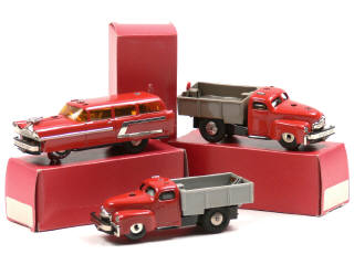 SCHUCO (ALLEMAGNE) Ensemble de 2 camions-plateaux & un break rouge & gris