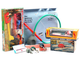 comprend un hélicoptère volant à pile, une fusée X15 à télécommande à air (boîte en état 'd'), un bateau, un hydroglisseur (partie centrale déformée), un moteur de bateau & 4 moteurs de hors-bord (3 modèles sans boîte & en état 'C') - on y retrouve notamment les marques : PLAYWELL, SCHILDKRÖT SPIELZEUG, ARCO-FALC , MERMAID, MABUCHI SHOJI, SCHUCO & FRAMUS MOTOR - certains modèles à moteur à piles (non testés)