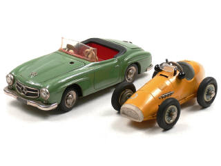 longueur 21,5 cm - moteur à piles (non testé) - ce modèle faisait partie du coffret ELEKTRO-PHÄNOMENAL - manque les 2 sièges & un support de pile - 2 petites fêlures sur le pare-brise - sigle de coffre oxydé