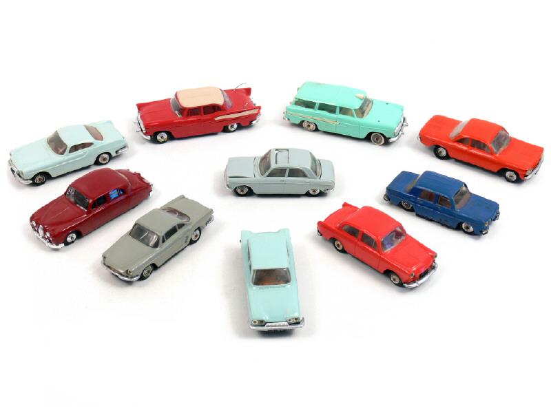 états de 'B' à 'E' - comprend : VOLVO P1800, JAGUAR 2L4, PEUGEOT 204 (toit ouvrant à refixer & capot-moteur déformé), CHEVROLET CORVAIR MONZA (carrosserie légèrement déformée), SIMCA BEAULIEU, FORD CONSUL 315, VOLKSWAGEN 1500, RENAULT FLORIDE (manque feux arrière), SIMCA MARLY ambulance (manque fanions & feux arrière) & RENAULT 8 GORDINI (incomplète avec suspensions affaissées) - jantes fondues sur 7 voitures - traces d'oxydation sur quelques axes de roues
