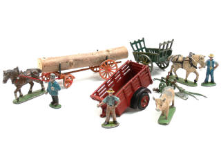 QUIRALU (FRANCE) Ensemble de 4 accessoires agricoles, 2 chevaux, 3 personnages & un boeuf