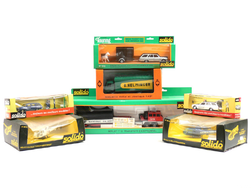 comprend : BERLIET T12 transport exceptionnel 'GDF GAZODUC DU MIDI' avec RENAULT 4 fourgonnette, figurine & planches de décalques, PEUGEOT 504 break avec remorque-van (avec cheval), PEUGEOT 504 break (avec brancard), RENAULT 12 break 'GENDARMERIE' avec motards, moto, radar & arbuste (jantes fondues), 2 hélicoptères GAZELLE 'EUROPE ASSISTANCE' avec planche de décalque, figurine & 'GENDARMERIE' avec planche de décalques - on y joint un BERLIET GR 190 fourgon bâché G. HELMINGER de la marque LBS avec boîte