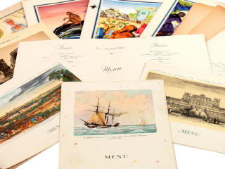comprend les paquebots : JADRAN, CHAMPLAIN, ILE DE FRANCE & S.S. FLANDRE - on y joint 21 feuilles de menus & de programme - petites taches & une annotation sur un exemplaire