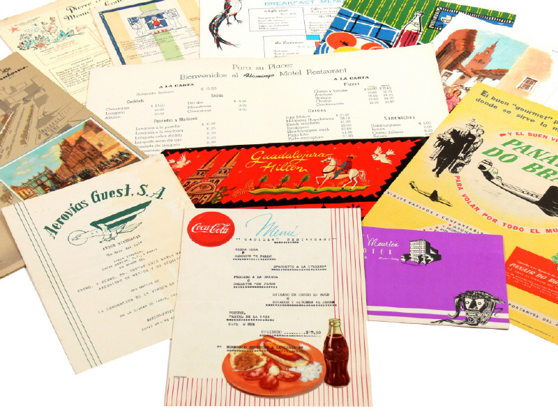 comprend notamment : PAM PAM, ITALIA, HOTEL HACIENDA VISTA HERMOSA, LADY BALTIMORE, RESTAUTANTE PRENDES, HOTEL COLONIAL, HOTEL DE LA BORDA, HOTEL PIERRE MARQUES, LE BISTROT, BAR-RESTAURANT LEAO, LA CABANA, AEROVIAS GUEST S.A., CADILLAC RESTAURANT, THE MEURICE, GUADALAJARA HILTON, SANBORNS, PIERRE TERRACE, LIDO, DUNAJ & AIR FRANCE - un exemplaire incomplet