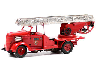 longueur 39 cm - moteur à clef & phares électriques (à revoir) - manque pare-chocs, cerclage de volant, un élément de support d'échelle & pompiers - traces d'oxydation