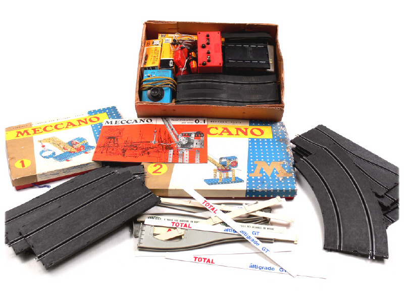 états de 'C' à 'F' - comprend : une B.R.M., 3 poignées, 2 transformateurs, un compte-tours, des rails & des éléments de décor - on y joint 2 boîtes n°1 & n°2 incomplètes de la marque MECCANO