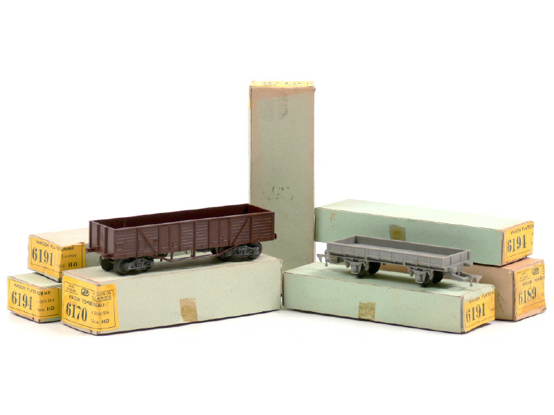 comprend : 2 wagons-plateformes (référence 6191), 2 wagons-plateformes à bogies (référence 6194), 2 wagons-tombereaux (référence 6170) & un wagon-tombereau à bogies (référence 6189) - avec bons de contrôle