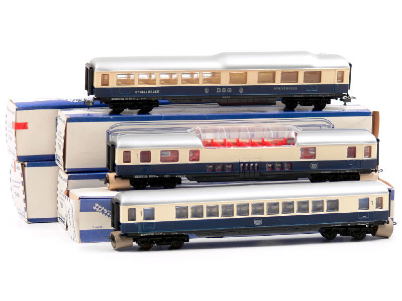 HORNBY 'HO' Ensemble de 5 voitures de voyageurs type 'RHEINGOLD' bleu marine, crème & gris