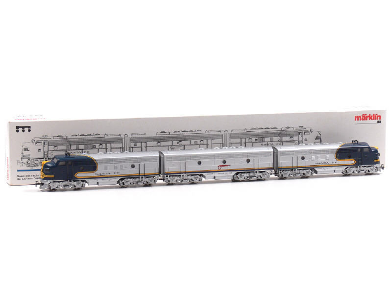MÄRKLIN 'HO' (ALLEMAGNE) 3362 Motrice diesel type-électrique GM EMD F 7 'SANTA FE' à 3 éléments gris métal & bleu, filets jaunes