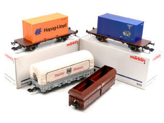 MÄRKLIN 'I' (ALLEMAGNE) 85830 Wagon-plateau à ridelles basses bâché 'MÄRKLIN MUSEUM' gris clair, bâche crème