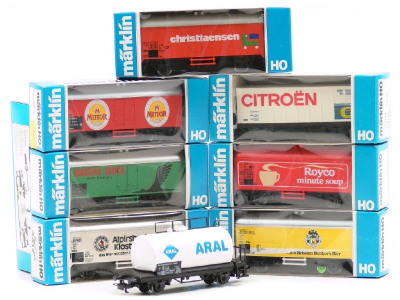 MÄRKLIN 'HO' (ALLEMAGNE) Ensemble de 6 wagons couverts, un wagon porte-container & un wagon-citerne