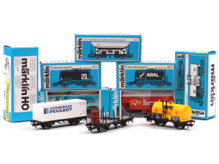 comprend : 3 wagons-citernes 'BP', 'SHELL' & 'ARAL', 2 wagons porte-containers 'AUTOMOBILES PEUGEOT' & '10ème SALON INTERNATIONAL DE LA MAQUETTE & DU MODELE REDUIT', un wagon couvert 'KRONENBOURG, un wagon-trémie & un wagon-plateau à ranchers avec vigie & berceau pivotant