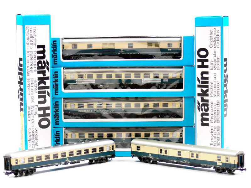 MÄRKLIN 'HO' (ALLEMAGNE) Ensemble de 4 voitures de voyageurs & 2 fourgons à bagages des chemins de fer allemands bleu, beige & gris métal