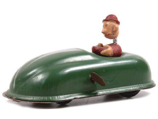 longueur 24,5 cm - moteur à clef (fonctionne) - avec personnage en bois peint - traces d'oxydation sur le plancher & le moteur - levier de marche arrêt & clef bloqués