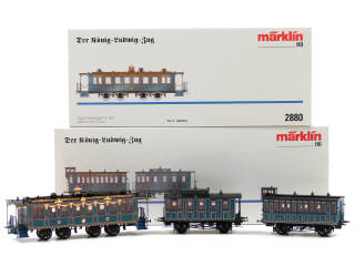 MÄRKLIN 'HO' (ALLEMAGNE) 4498 Coffret de 2 voitures de voyageurs du train du roi LUDWIG bleu & noir, filets or