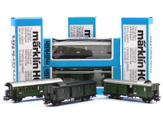 MÄRKLIN 'HO' (ALLEMAGNE) Ensemble de 2 voitures de voyageurs & 3 wagons-fourgons à bagages