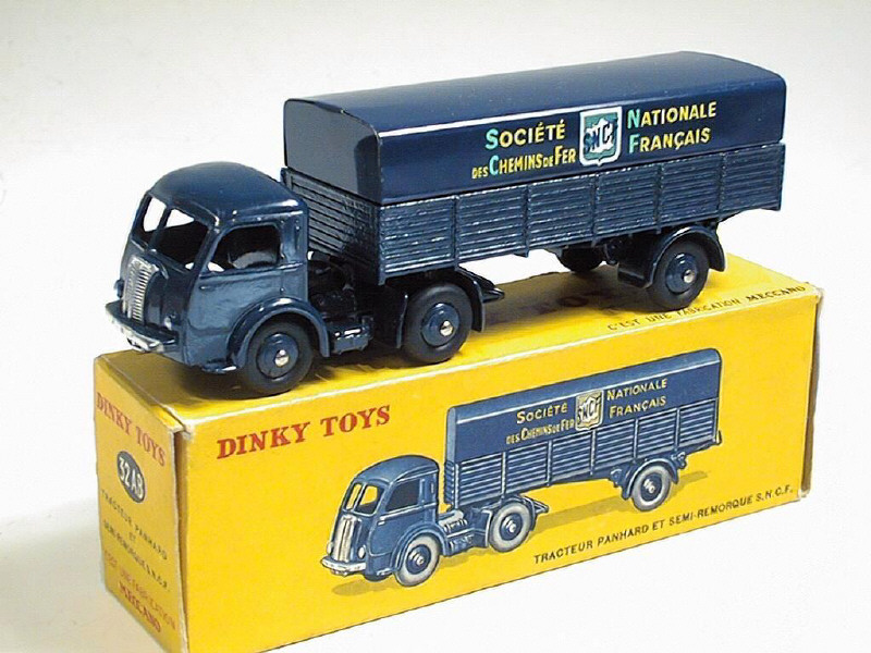 DINKY TOYS (FRANCE) 32AB PANHARD Semi-remorque 'S.N.C.F' (version avec intérieur de toit quadrillé) bleu foncé (fond de l'écusson quadrillé)