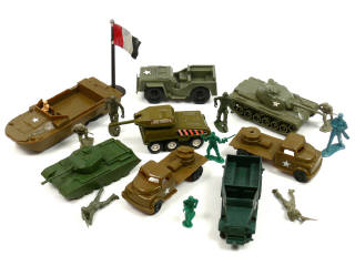 états de 'B' à 'D' - comprend : 11 engins militaires, 2 canons, un avion & 65 figurines - petits manques - on y retrouve notamment les marques : PYRO, BUDDY L, TIM-MEE TOYS, MARX TOYS & TOOTSIE TOYS