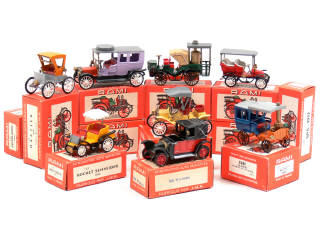 miniatures reproduisant les modèles : FORD, AMEDEE BOLLEE, PANHARD & LEVASSOR, RENAULT; GOBRON BRILLIE, DEDION BOUTON, ROCHER SCHNEIDER, PEUGEOT, GAUTHIER-WEHRLE, SPA, GEORGES RICHARD, LUC COURT, HAUTIER & SCOTTE - traces d'oxydation sur les axes de roues