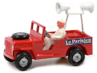 publicités 'LE PARISIEN' - avec conducteur & volant en plastique - dernière production de la marque avec étiquette collée sous le châssis 'CONFORMITE AUX NORMES'