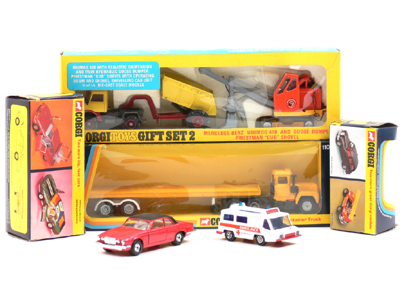 CORGI TOYS (GB) GS2 MERCEDES-BENZ UNIMOG 406 avec semi-benne basculante & pelleteuse PRIESTMAN orange, jaune & grenat