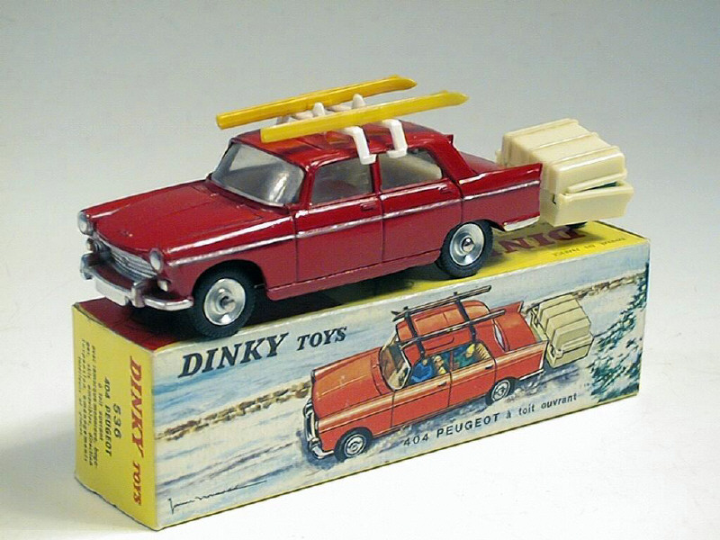 DINKY TOYS (FRANCE) 536 PEUGEOT 404 avec remorque monoroue (skis jaunes) rouge