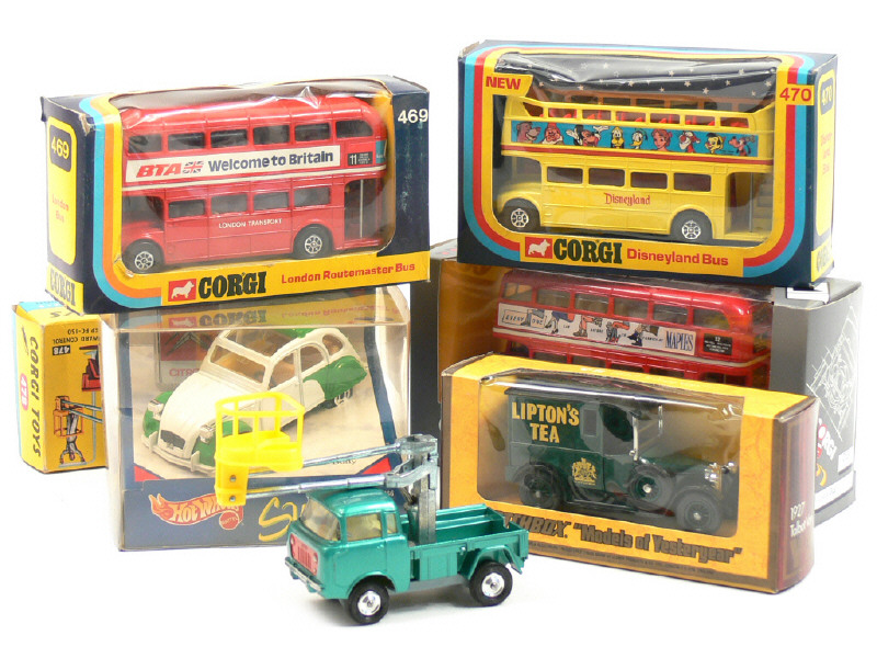 miniatures reproduisant les modèles : AEC, CITROËN, JEEP (bras élévateur dériveté), ROUTEMASTER & TALBOT - on y retrouve les marques : CORGI TOYS, MATTEL & MATCHBOX - une boîte en état 'c'