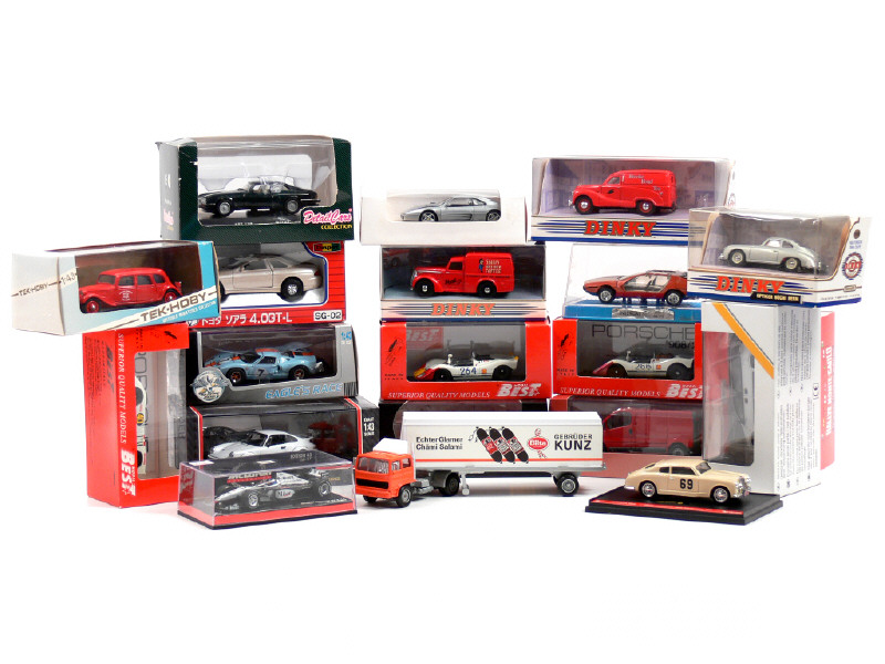 miniatures reproduisant les modèles : PORSCHE, CITROËN, OPEL, COMMER, Mc LAREN MERCEDES, FERRARI, JAGUAR, MITSUBISHI, FORD, TOYOTA, AUSTIN, LANCIA, LAMBORGHINI & RENAULT - un modèle promotionnel pour la Suisse sans boîte, un autre avec boîte non conforme & une boîte en état 'c' - on y retrouve les marques : DINKY MATCHBOX, TEK-HOBY, MINICHAMPS, HERPA, INTERCARS, BRUMM, EAGLE'S RACE, IXO, DETAIL CARS, DIAPET, SOLIDO & SCHUCO