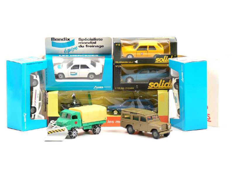 comprend : RENAULT 12 break 'GENDARMERIE' avec moto, 2 figurines & accessoires, CITROËN CX 2200, VOLKSWAGEN GOLF 'PTT SUISSE, LAND ROVER, FORD FIESTA 'BENDIX', FORD ESCORT 'BENDIX', MERCEDES 190 'BENDIX & SIMCA-UNIC 4x4 chasse-neige - 2 boîtes en état 'c' & un modèle sans boîte