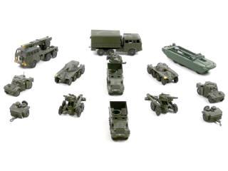 DINKY TOYS (FRANCE) Ensemble de 9 véhicules militaires, 3 remorques & 2 canons kaki