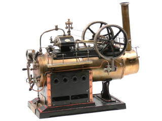 dimensions : 44 x 18,5 x 39 cm - imposante machine très détaillée - avec brûleur & 2 pistons - manque une fixation de bielle, une vis & une poignée de robinet - 2 soudures & filets rouges non d'origine - PIECE EXCEPTIONNELLE !