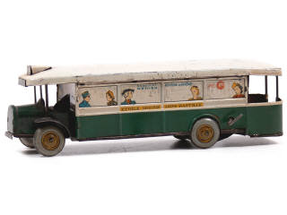 longueur 27 cm - moteur à ressort (fonctionne de manière aléatoire) - avec direction - belles illustrations & publicités sur les vitres - manque quelques agrafes