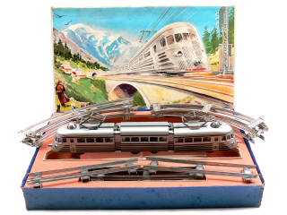 dimensions du coffret : 54,5 x 37 cm - contient un autorail à 3 éléments avec moteur (fonctionne) & éclairage à pile (non testé) - avec 6 rails courbes, 6 rails droits & cale de boîte