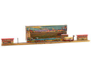 longueur 38 cm - moteur à clef (fonctionne poussivement) - avec clef - sur un décor de littoral le bateau sort du port, navigue jusqu'au phare, puis revient vers le point départ - avec phare électrique (non testé)